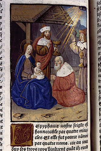 Ce symbolisme que recouvre la représentation des trois Rois mages est particulièrement visible dans l’épisode biblique de l’Adoration des Mages, une des scènes les plus populaires de l’iconographie chrétienne. Ainsi, sur la miniature de la Légende dorée de Jacques de Voragine3 conservée dans le fonds ancien de la Bibliothèque universitaire de l’UCO, les Rois mages vêtus de costumes royaux adorent l’enfant Jésus placé sur les genoux de sa mère, devant l’étable où il est né. Selon un rituel codifié dans l’iconographie occidentale dès le Moyen Age central, ils sont représentés, rendant hommage à l’Enfant, du plus âgé au plus jeune. Au premier plan, Melchior, dont on distingue la barbe et La légende dorée de Jacques de Voragine. Image extraite du Folio 32v. Bibliothèque UCO les cheveux blancs, est agenouillé en prière devant l’Enfant, son couvre-chef déposé en signe d’humilité. Au deuxième plan, à gauche, Balthazar, cheveux bruns tout comme sa barbe, pointe du doigt le calice qu’il tient alors que le jeune Gaspard, à droite, nous montre les rayons dorés de l’étoile divine ayant conduit leurs pas.